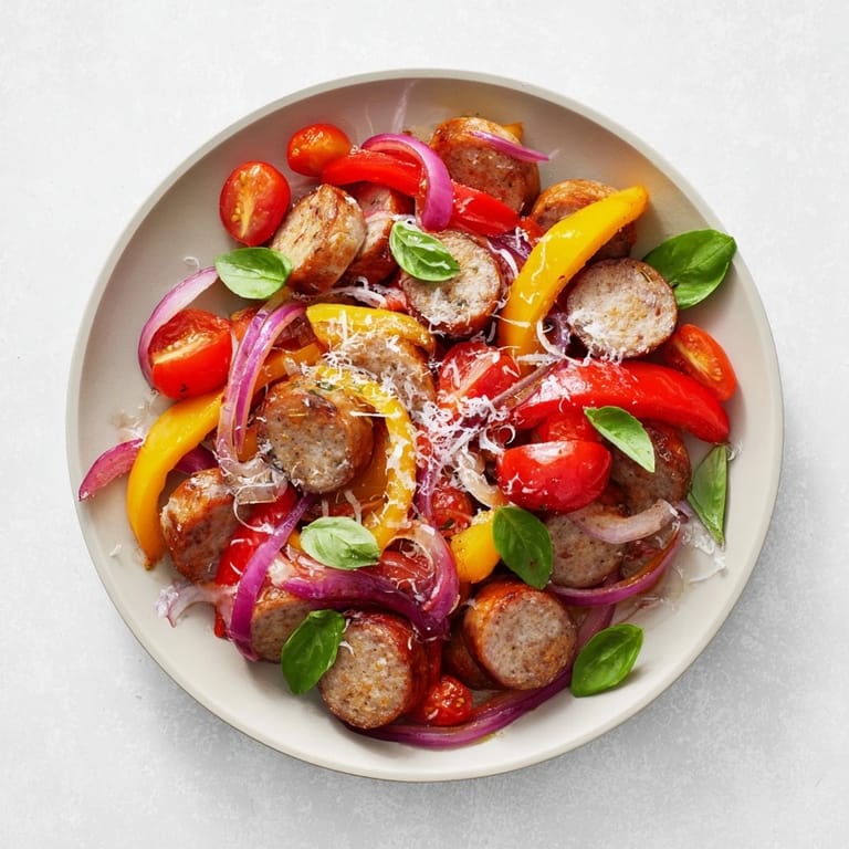 Pin It A vibrant, quick one-pan meal featuring juicy sausage, sweet bell peppers, and a burst of fresh basil for a flavor-packed weeknight dinner.