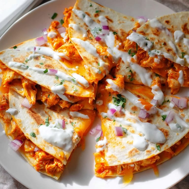 Pin It My friend texted me last Sunday asking what to make for the guys coming over to watch the game, and I immediately thought of buffalo chicken quesadillas. There's something about the way melted cheese gets crispy at the edges while the spicy chicken stays tender inside that just works for feeding a crowd without fussing. I'd made them once at midnight after a long shift, half-asleep but somehow nailing the cheese-to-sauce ratio, and they turned into this thing people still ask me to bring to gatherings. It's become my reliable move when I want something that tastes way more impressive than the actual effort it takes.