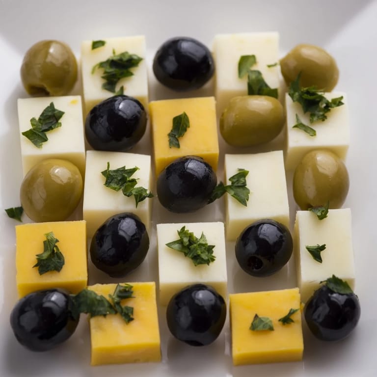 Pin It A visually striking appetizer featuring alternating cubes of cheese and olives arranged like a chessboard. Perfect for parties and gatherings.