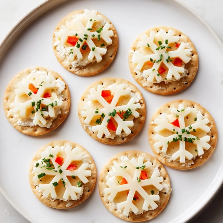 Pin It A festive and elegant appetizer featuring crisp crackers topped with creamy cheese cut into delicate snowflake shapesβperfect for holiday gatherings or as a whimsical party starter.