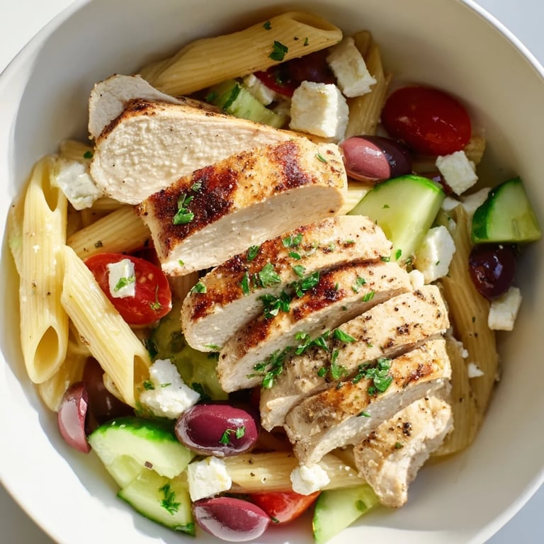 - Pour dressing over the pasta mixture and toss well. Top with sliced chicken, crumbled feta, and fresh parsley, then serve immediately.