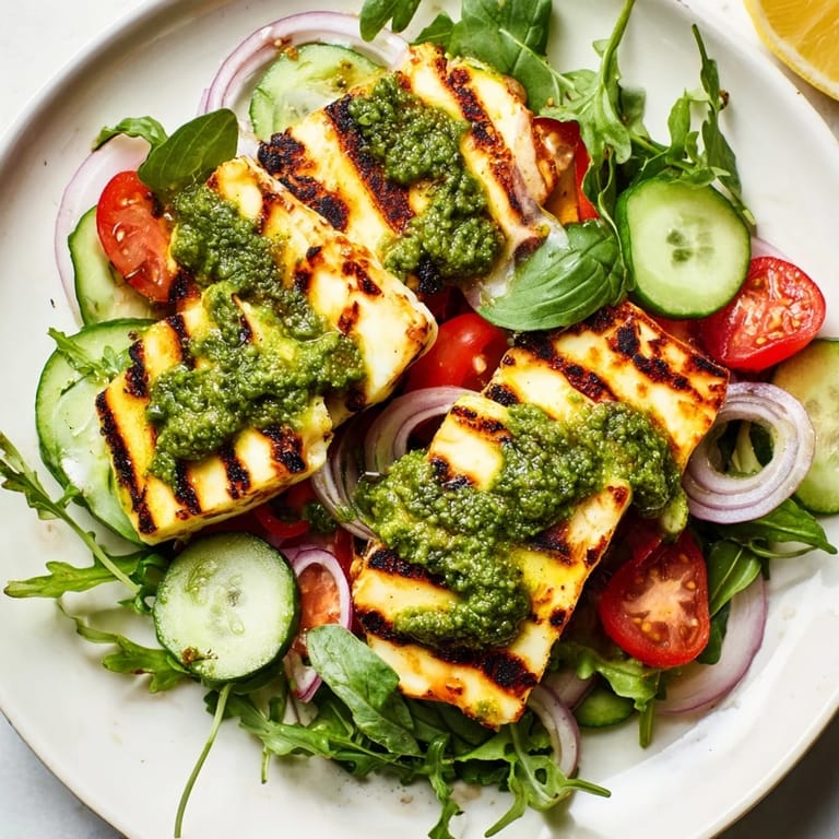 Pin It A vibrant, summery dish featuring golden grilled halloumi cheese served atop a bed of crisp vegetables and drizzled with fresh basil pesto. Perfect for a light, garden-inspired dinner.