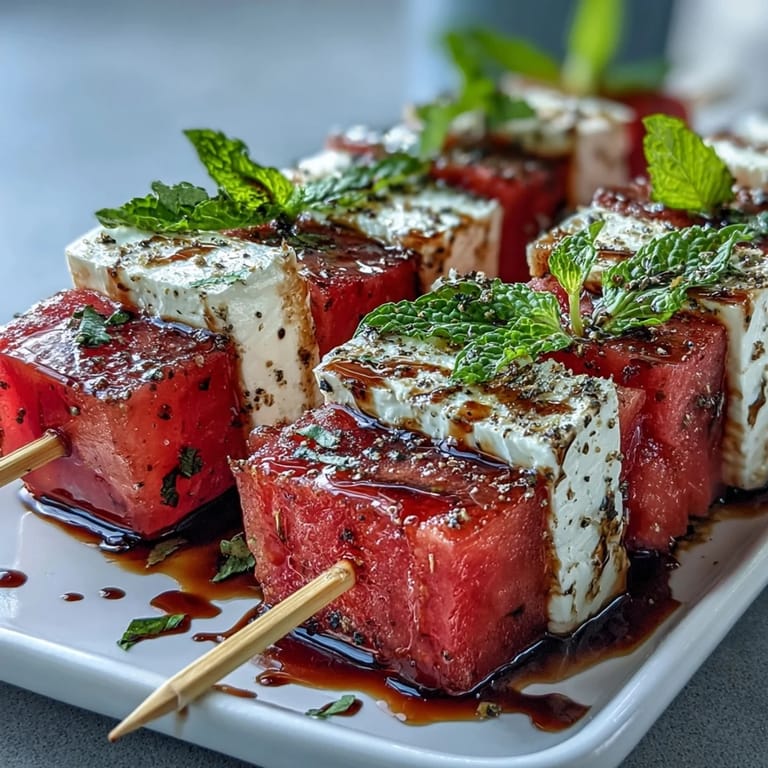 Pin It There's something about summer entertaining that makes me want to skip the fussy appetizers altogether. One afternoon, while my neighbor brought over the most beautiful watermelon from her garden, I stood in my kitchen thinking about how to make something that didn't require heating anything up. I grabbed feta from the fridge, snipped mint from the windowsill, and suddenly these skewers came together—the kind of thing that looks impressive but feels almost like cheating because it's so effortless.