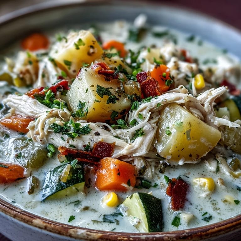 Pin It There's something magical about the smell of chicken roasting while you chop vegetables on a busy weeknight—it fills the kitchen with this warm promise that dinner will be comforting and ready soon. My neighbor stopped by one October evening just as I was pulling a batch of herb-crusted chicken from the oven, and I impulsively invited her to stay for soup. Within an hour, we had this creamy ranch chicken and vegetable chowder simmering on the stove, and she asked for the recipe before she even finished her bowl. It's become my go-to when the weather turns and everyone needs something that tastes like a hug.