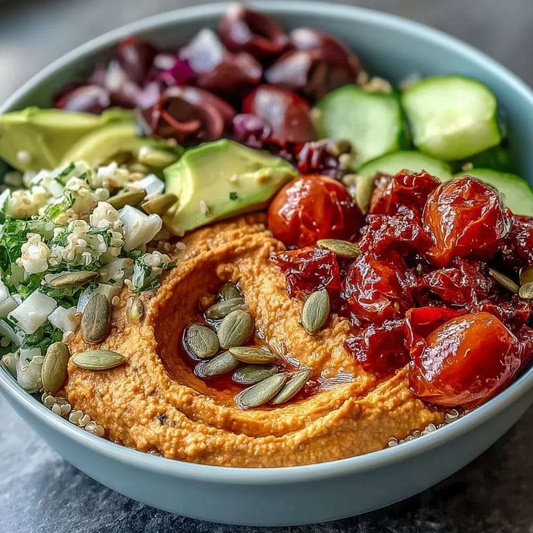 Pin It I stumbled upon these bowls on a Tuesday when my fridge felt emptier than my willpower, and I had half a roasted red pepper sitting in a container wondering about its purpose. Blending it into hummus felt like discovering a secret, and suddenly that ordinary lunch transformed into something I couldn't stop making. The first time I assembled one, I realized this wasn't just food—it was a canvas where every vegetable got to shine without apology. Now, whenever someone asks what I eat on busy weekdays, these bowls are the honest answer.